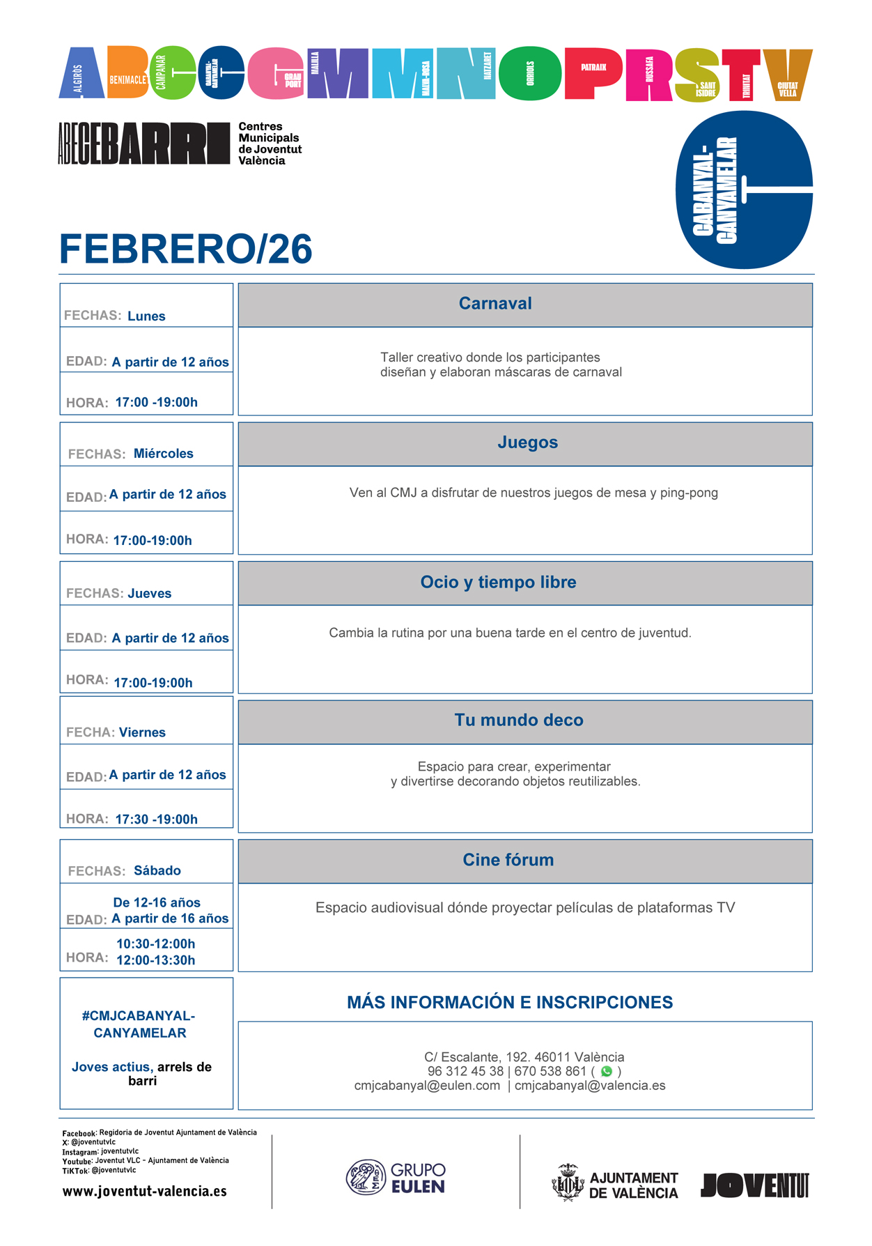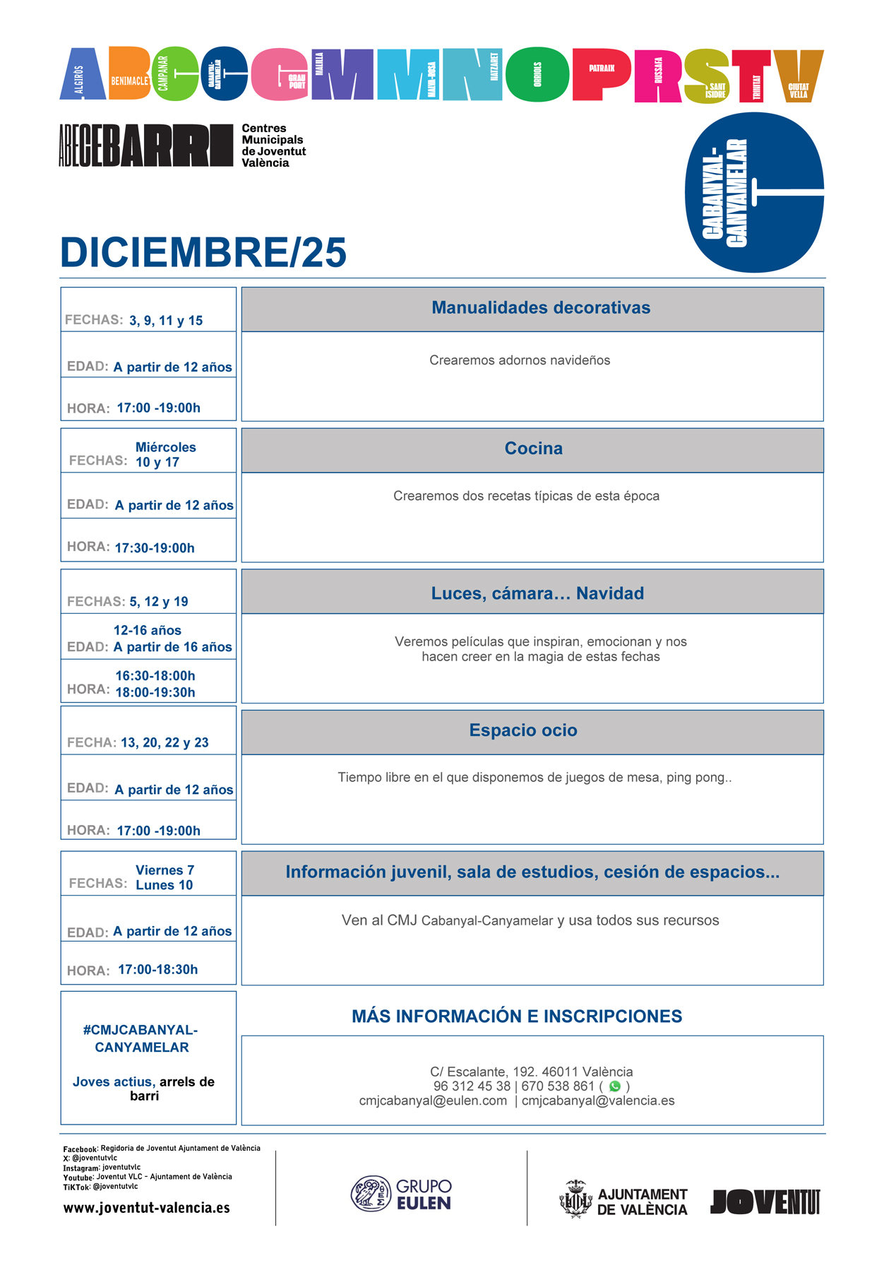 Los técnicos de juventud del CMJ Cabanyal – Canyamelar te informarán de todos aquellos asuntos de tú interés: empleo, vivienda, cultura, etc. Así como de todos los talleres, actividades y servicios que se prestan a nivel de barrio y de ciudad.