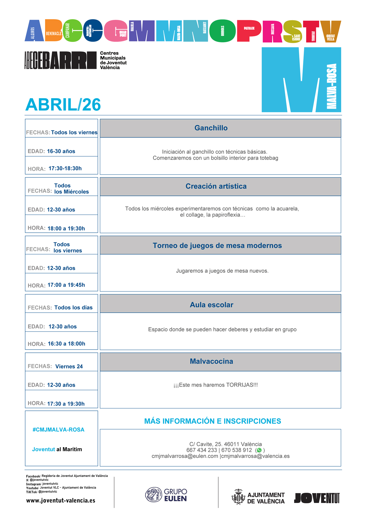 Los jóvenes de Malva–rosa ya tienen su centro Municipal de Juventud en la C/ Cavite, 25. En esta planta baja de 300 metros cuadrados, en sus salas multiusos podrás disfrutar de todas las actividades culturales y de ocio educativo, de ordenadores públicos y ser atendido por profesionales que te informarán, asesorarán y orientaran en todas las materias de tu interés.