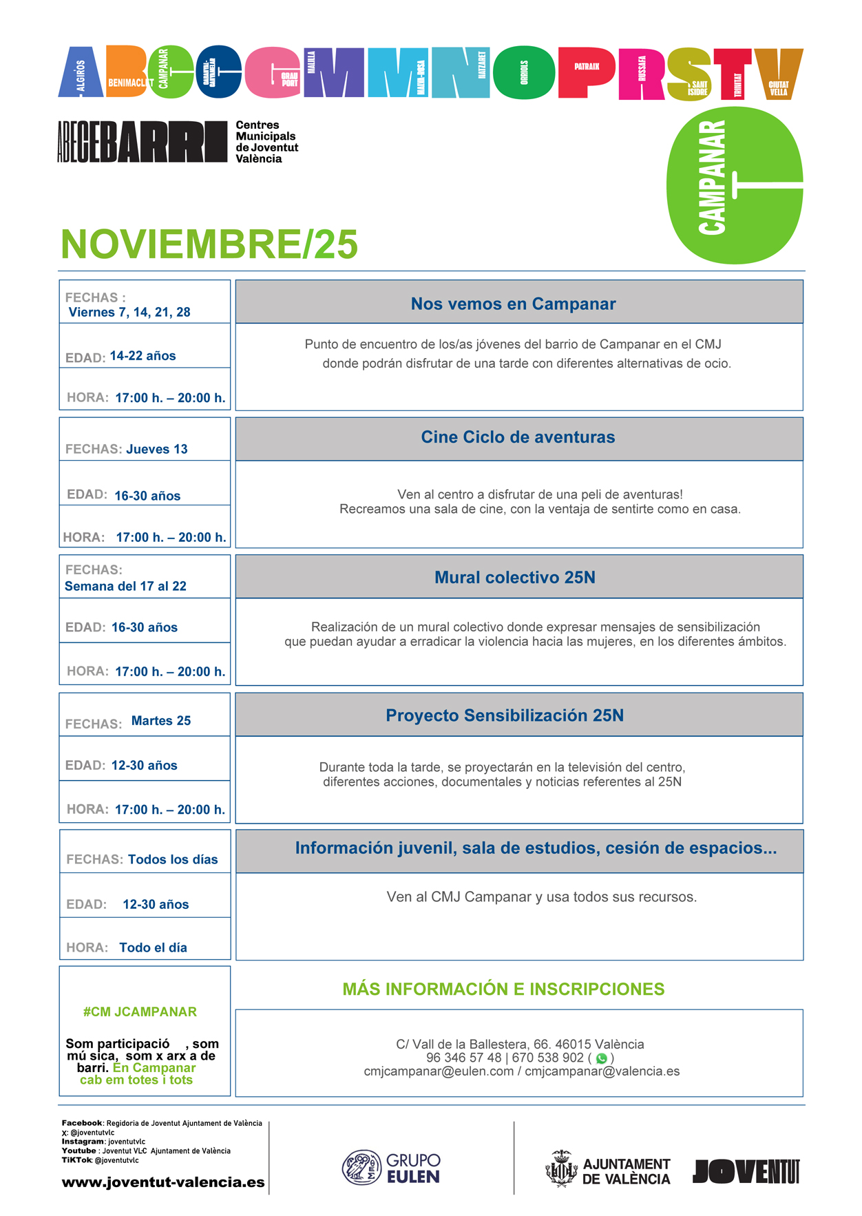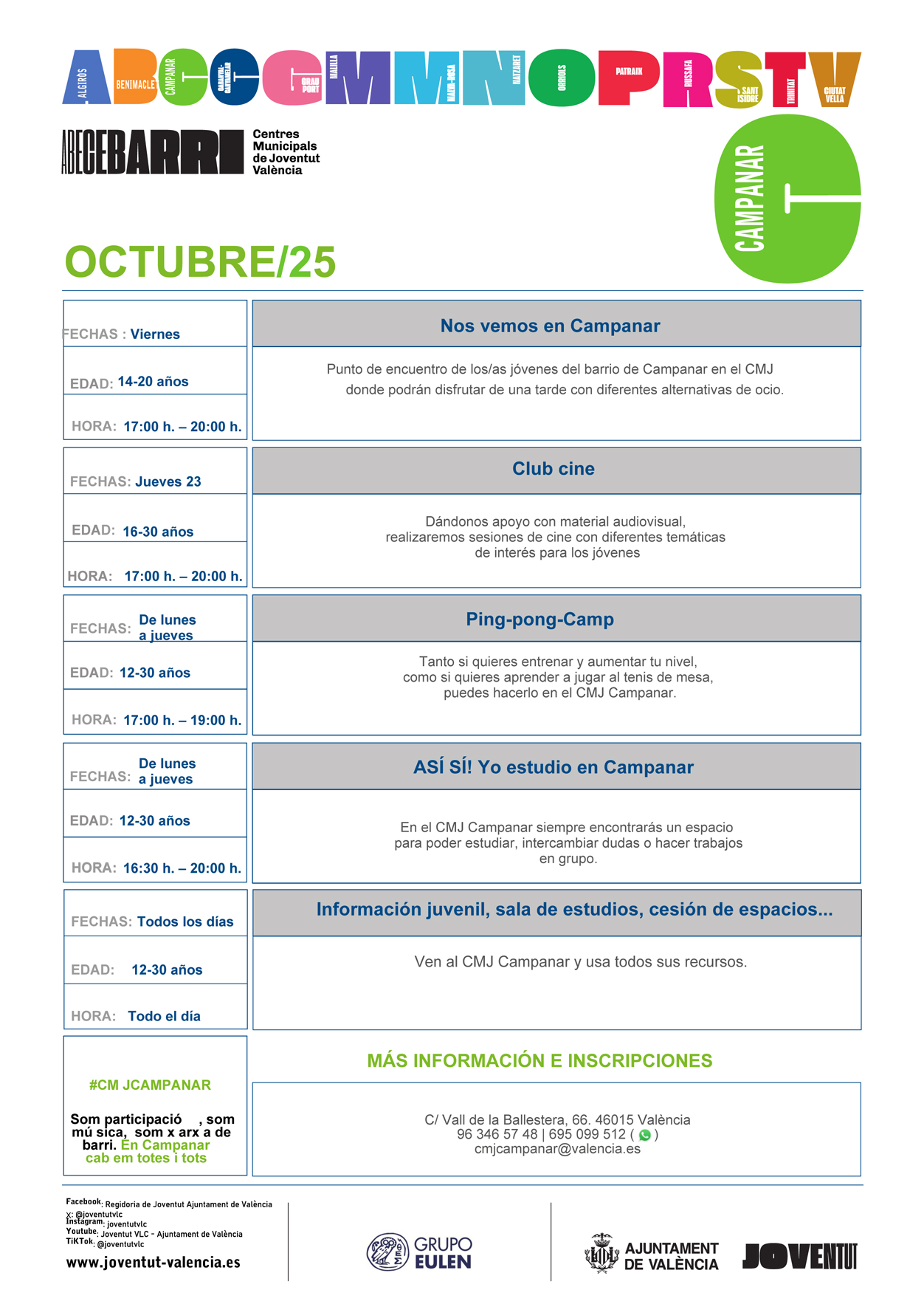 Desde el Centro Municipal de Juventud de Campanar trabajamos con las instituciones y asociaciones de la zona, fomentando la dinamización de actividades para jóvenes y desarrollando programas que promueven el empoderamiento juvenil en el barrio. Os emplazamos al hecho que vengáis a descubrir un espacio que está pensado para vosotras y vosotros. Acercaros a vuestro CMJ para solicitar información sobre lo que necesitáis o haceros el Carné Joven. Además podéis hacer uso de aulas y espacios donde reunirnos, debatir, ensayar, estudiar...