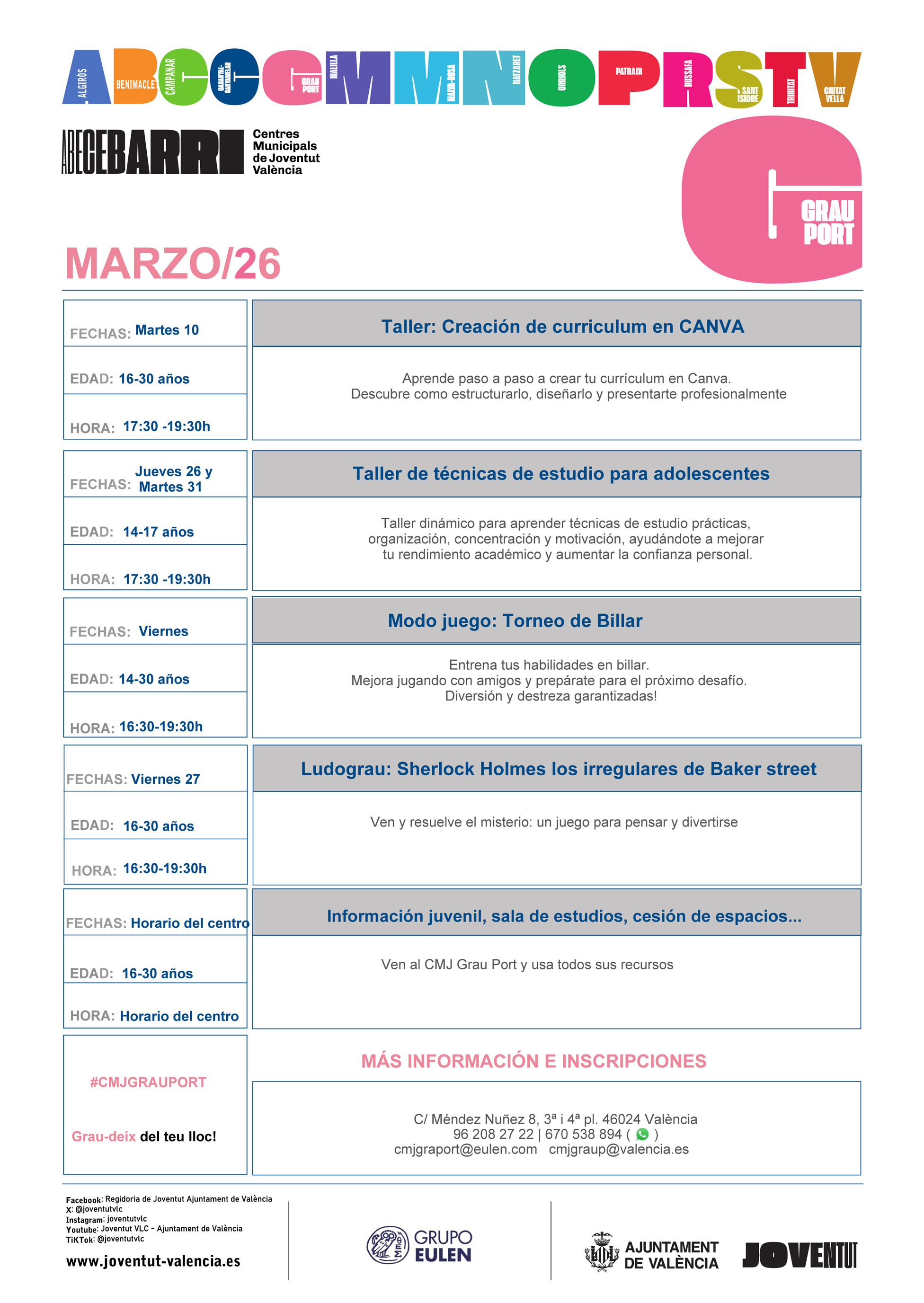 En el CMJ Grau-Port podrás encontrar un espacio diferente y abierto donde la juventud es la gran protagonista. Un espacio donde pedir información, tramitar el carné joven, realizar actividades, conectarte a internet en la zona Wifi o encontrarte con tu gente para disfrutar de tu tiempo libre.
