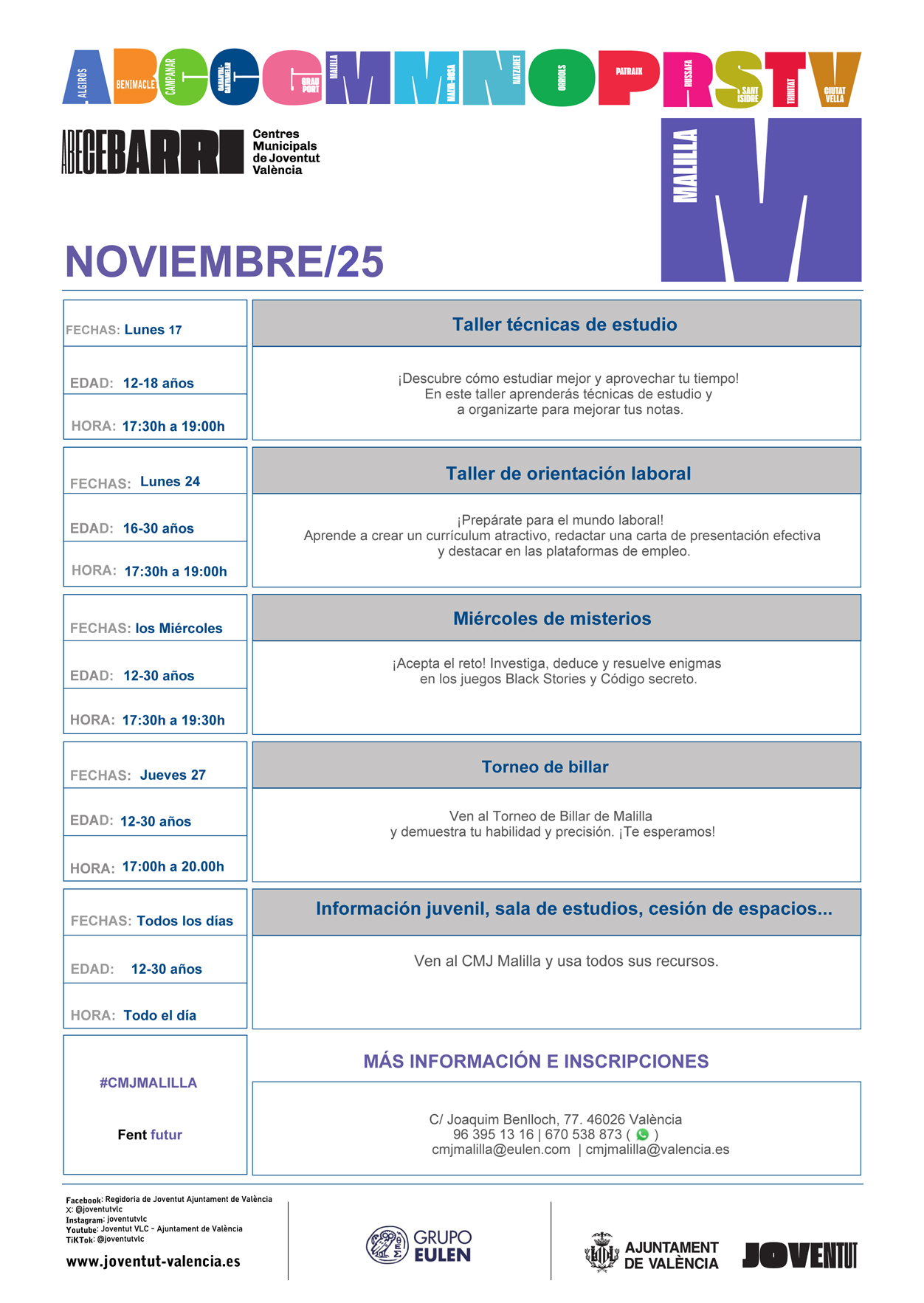 El CMJ Malilla es un espacio público, abierto a todos y todas las jóvenes, plural y democrático, participativo, que te ayudará a ser un joven activo y crítico.