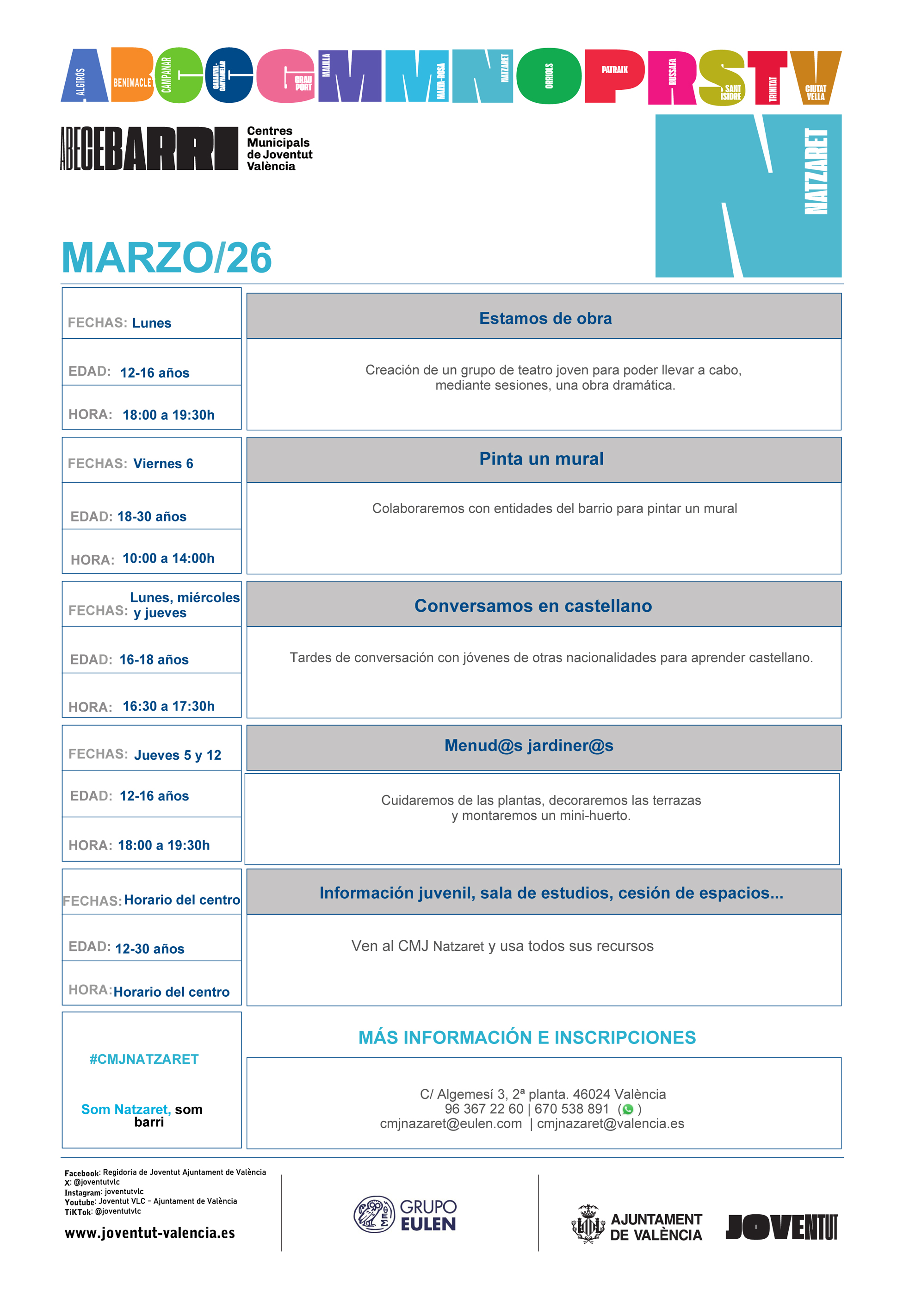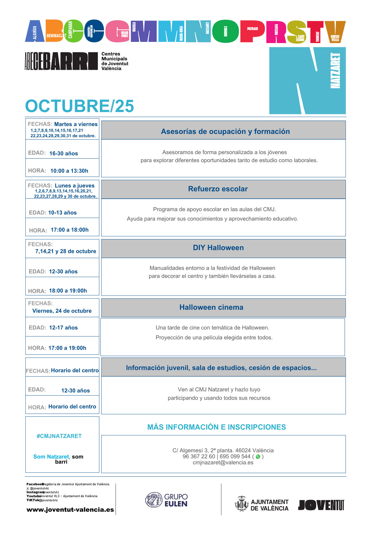 CMJ Natzaret se caracteriza por ser un centro acogedor, que crea lazos y te trata de manera personalizada. Nos interesa la igualdad, el respeto, el medio ambiente, la solidaridad y el trabajo en red.