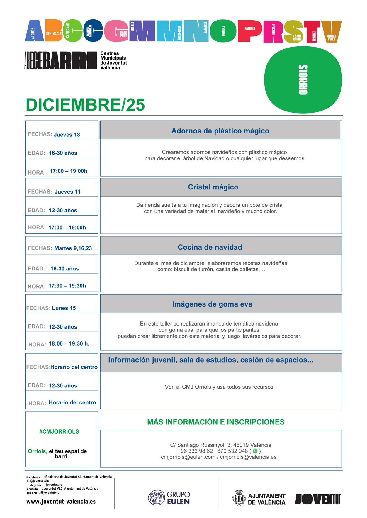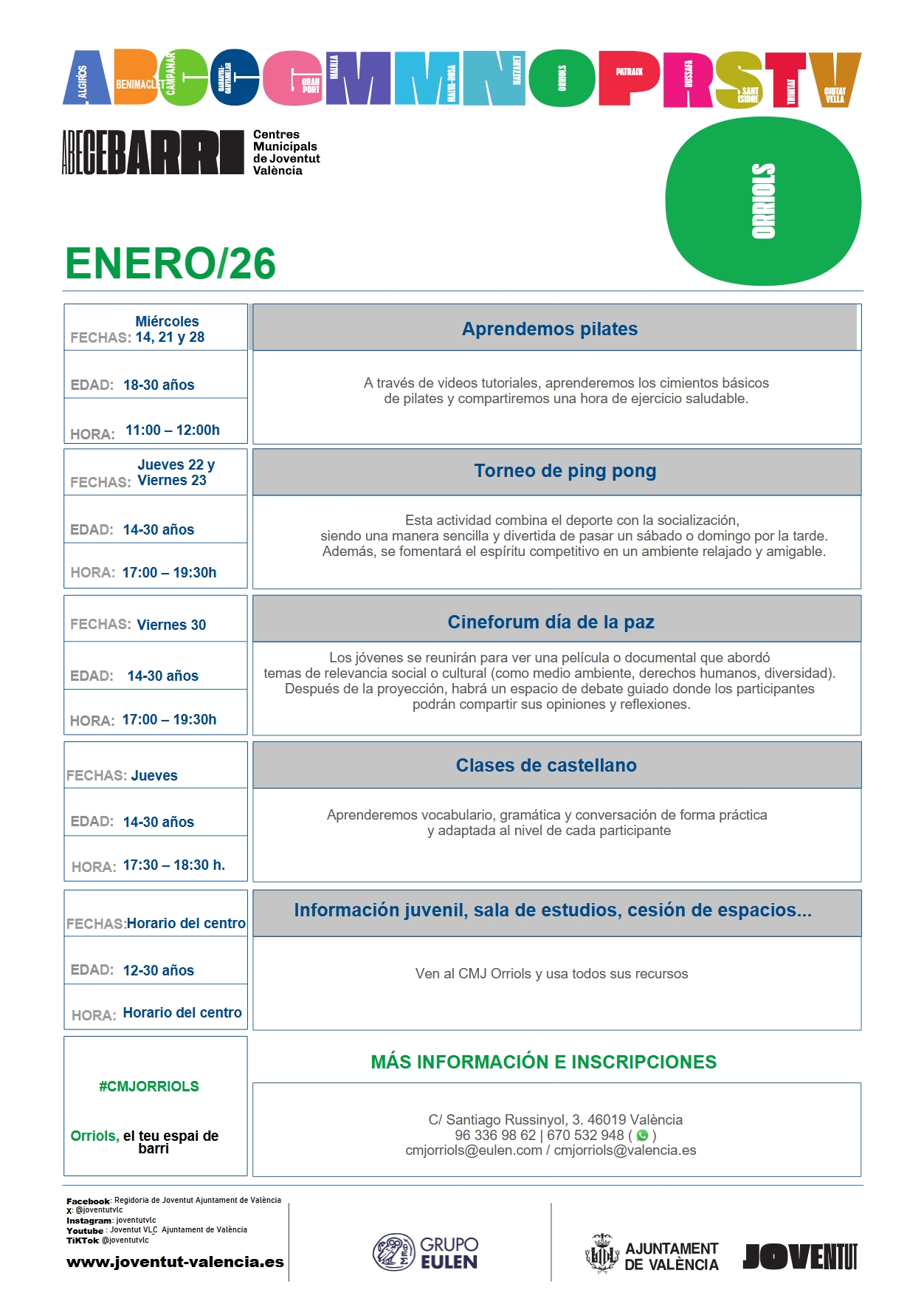 El CMJ de Orriols es un espacio de encuentro para jóvenes, asociaciones y entidades dónde además de ofrecerte toda la información que nos solicites, también podrás disfrutar de actividades para tu enriquecimiento y desarrollo personal.