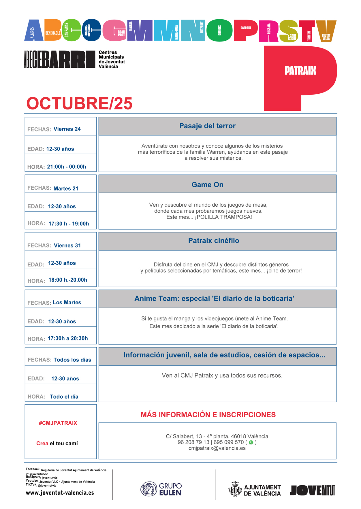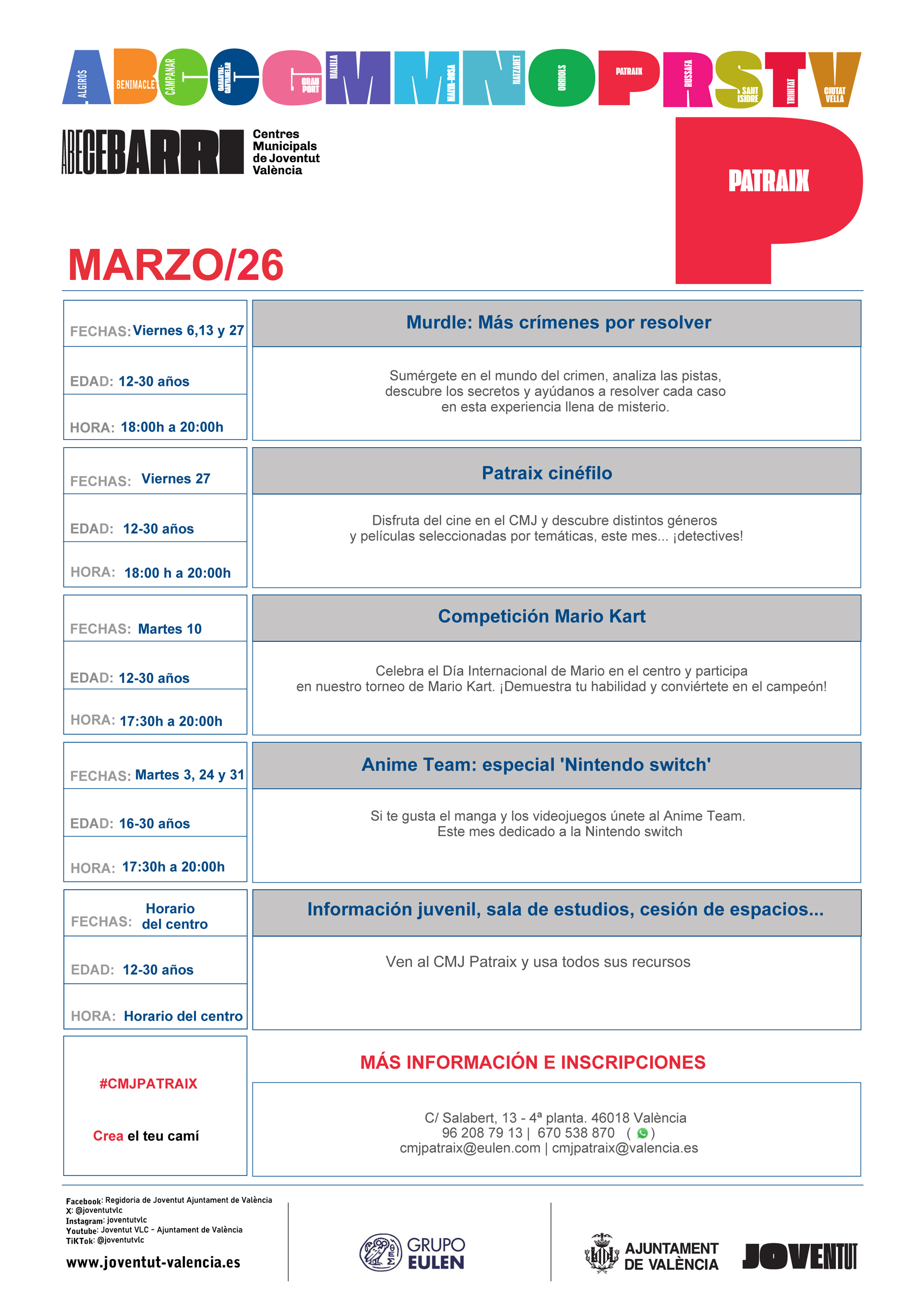 En el CMJ de Patraix siempre hacemos la planificación con vuestras propuestas, cada mes las actividades varían según vuestros intereses.