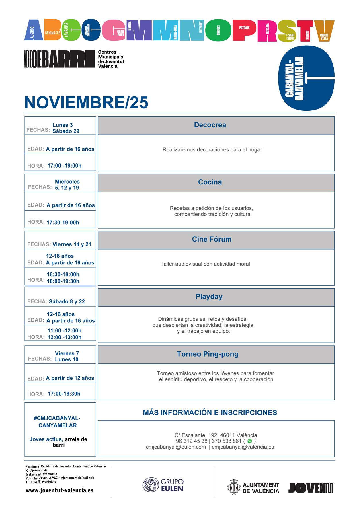 Los técnicos de juventud del CMJ Cabanyal – Canyamelar te informarán de todos aquellos asuntos de tú interés: empleo, vivienda, cultura, etc. Así como de todos los talleres, actividades y servicios que se prestan a nivel de barrio y de ciudad.