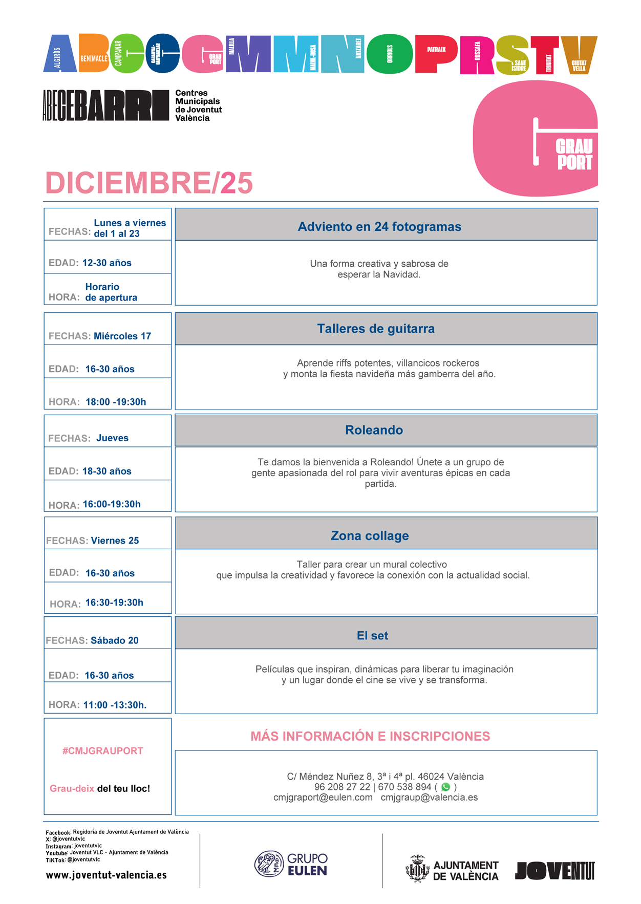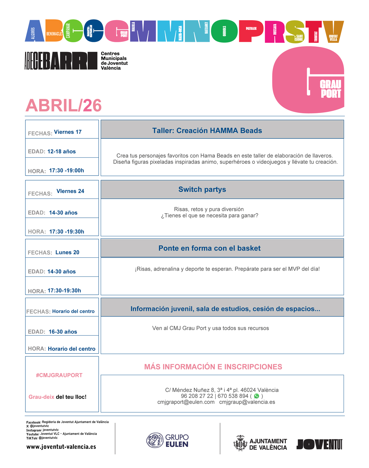 En el CMJ Grau-Port podrás encontrar un espacio diferente y abierto donde la juventud es la gran protagonista. Un espacio donde pedir información, tramitar el carné joven, realizar actividades, conectarte a internet en la zona Wifi o encontrarte con tu gente para disfrutar de tu tiempo libre.