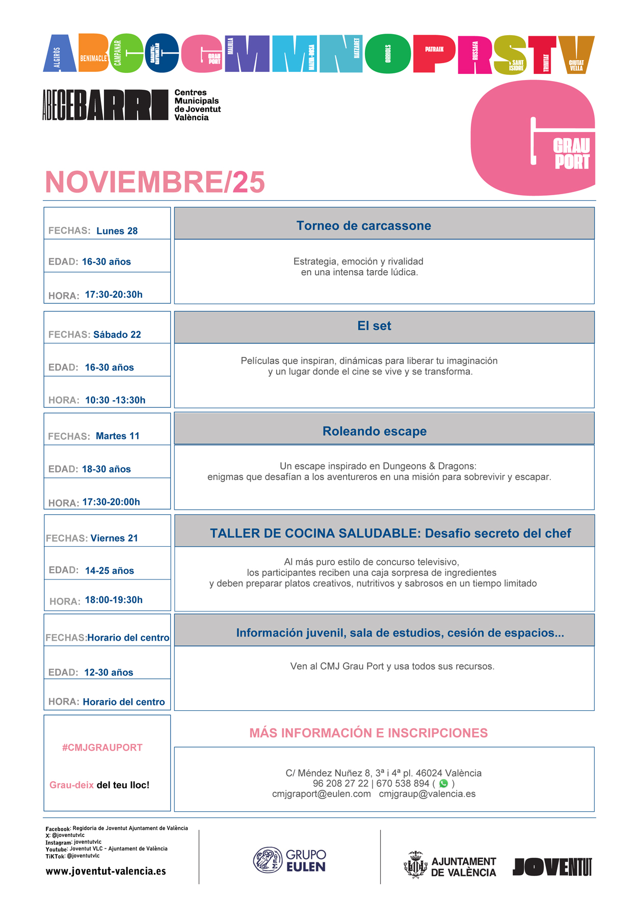 En el CMJ Grau-Port podrás encontrar un espacio diferente y abierto donde la juventud es la gran protagonista. Un espacio donde pedir información, tramitar el carné joven, realizar actividades, conectarte a internet en la zona Wifi o encontrarte con tu gente para disfrutar de tu tiempo libre.