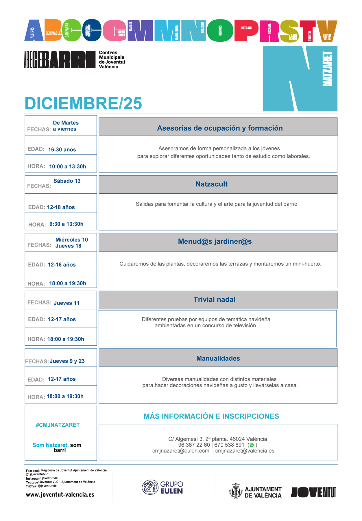 CMJ Natzaret se caracteriza por ser un centro acogedor, que crea lazos y te trata de manera personalizada. Nos interesa la igualdad, el respeto, el medio ambiente, la solidaridad y el trabajo en red.