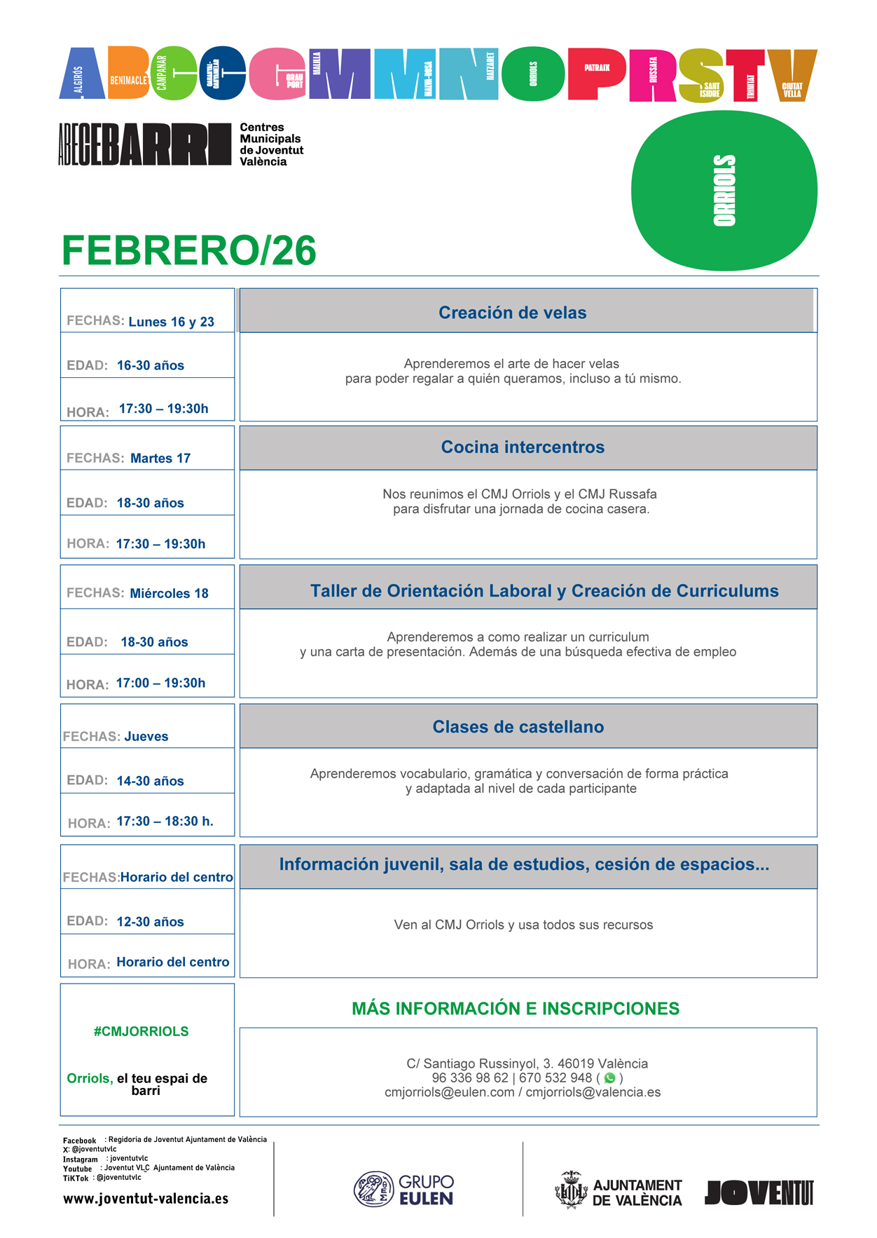 El CMJ de Orriols es un espacio de encuentro para jóvenes, asociaciones y entidades dónde además de ofrecerte toda la información que nos solicites, también podrás disfrutar de actividades para tu enriquecimiento y desarrollo personal.