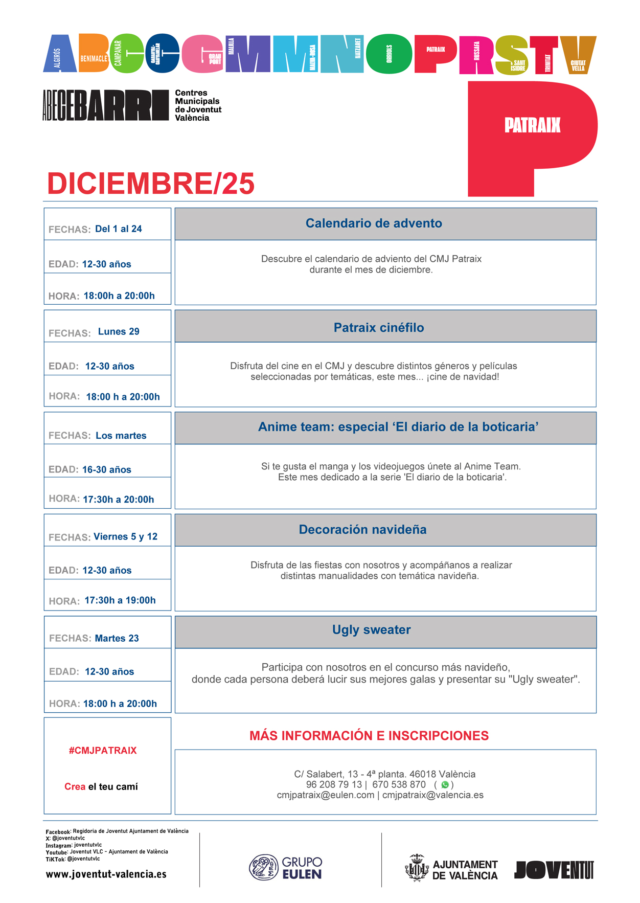 En el CMJ de Patraix siempre hacemos la planificación con vuestras propuestas, cada mes las actividades varían según vuestros intereses.